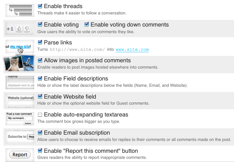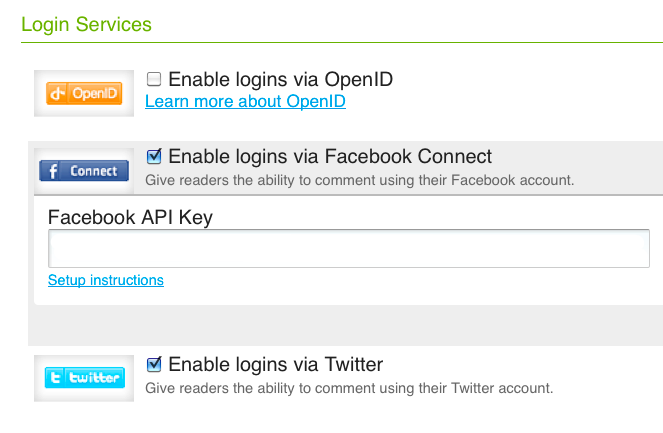 2. Twitter Sign-in: it’s a piece of cake to activate, just select the checkbox next to Twitter Sign-in and you’re all set to give your readers the option to use their Twitter accounts to comment. Check out our Twitter documentation.