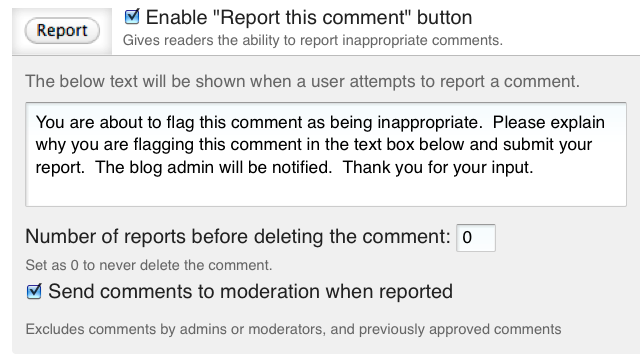 You also have the option to set the maximum number of times a comment can reported before it’s automatically deleted. Don’t worry, we restrict the number of times that a single user can report a comment (by IP address), so you don’t have to worry about abuse of this feature.