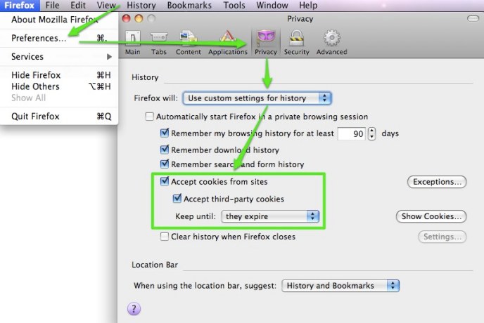 - Mac – From the top menu bar select “Firefox” > “Preferences” >”Privacy” > “Use custom settings for history” > select the checkbox for third-party cookies and keep them until they expire.