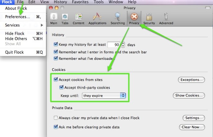 - PC – From the top menu bar select “Tools” > “Options” >”Privacy” > “Use custom settings for history” > select the checkbox for third-party cookies and keep them until they expire.