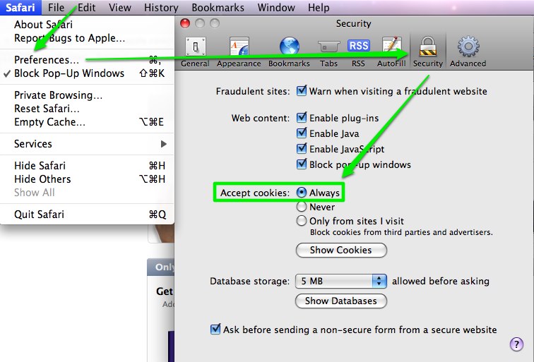 Please make sure that your web browser preferences are set to accept third-party cookies. Here’s how you can check for IE7 & 8, Firefox, Safari, Google Chrome, Flock, and Opera: