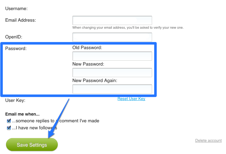 3. Type your old password, and then your new password in both boxes, and make sure you hit the big green Save Settings button.