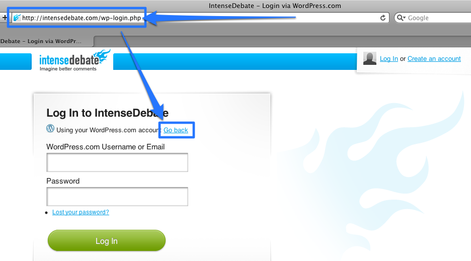 3. If you are at http://intensedebate.com/wp-login.php, please select the Go Back.